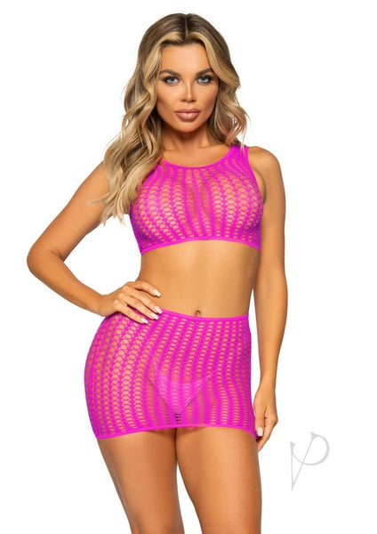 2 PC Crochet net tank crop top and mini skirt. O/S Neon Pink