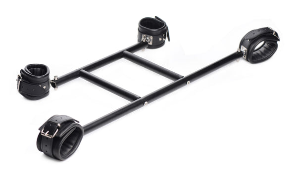 Your precious plaything will be trapped and at your mercy in this dual spreader system. Luxurious leather cuffs wrap around their wrists and ankles, adjusting to the perfect fit for comfort and security. Sturdy metal bars keep their arms and legs pried open so that their body is helpless to your gaze and touch. Have your way with them while they squirm in their restraints. The spreader bars can be connected or used separately, depending on how you want to play!