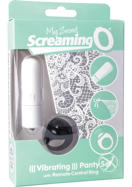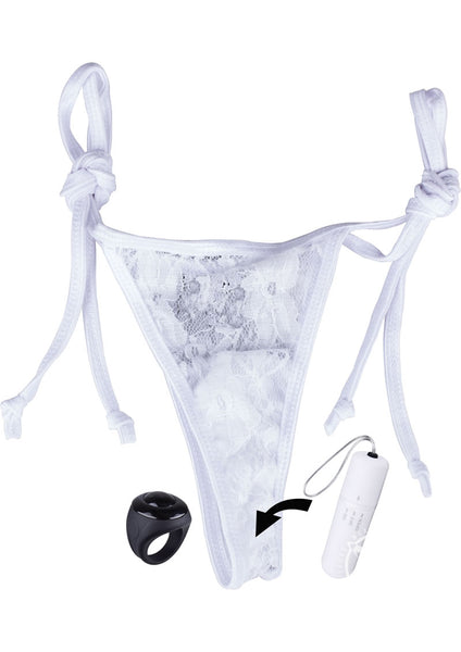 Put the power of pleasure into shoppers` hands with My Secret Vibrating Panty Set, a super-powered vibrating bullet that fits discreetly into a side-tie lace panty to keep it perfectly in place. Operated by a remote control disguised as a finger ring, the My Secret Vibrating Panty Set works from up to 50 feet away makes it fun and easy for couples to play in public. When worn in the panty`s pocket, the powerful Bullet sits comfortably against the body and buzzes with 10 different vibration functions designed to tease, please and make her plead for more. Discreet enough to wear under clothing and out on the town and sexy enough to match with any lingerie, the My Secret Vibrating Panty Set is a sexy solution for spicing up any sex life! - Latex and phthalate-free - Wireless - Water Resistant - Requires AG13 Battery - 80+ Minutes of battery life