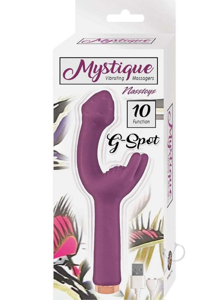 Mystique G-Spot features two powerful motors for dual stimulation to help achieve that great big O.   Press and hold the button on the bottom of the vibe to power on then press again to cycle through the 10 powerful functions.  The slim, textured vibe is perfectly curved to reach the g-spot while the firm twin ticklers surround the clitoris.  To charge, connect the magnetic charging points on the charger to the base of the product then plug the USB end into a power source.  Please clean with toy cleaner before and after each use.  Enjoy with a water-based lubricant. 10 FunctionBody safe siliconePhthalates freeWaterproofMaterials: Silicone and ABSSize: Length - 7, Insertable length - 3Rechargeable: Charging Time - 2 hours, Working Time - 1.5 hours, Voltage - 3.7V