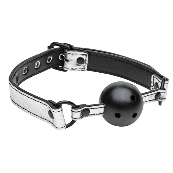 This perforated gag lets you restrict the speech of your plaything while still allowing them to breathe easily. The smooth plastic is tasteless and odorless, and large enough to gag them without being uncomfortable. The sexy embossed outer design is lined with soft, padded neoprene and is accented with black, nickel free hardware. The strap is fully adjustable, and closes with a rolling buckle.
