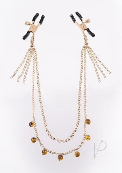 Dive into a luxurious look and grace your bust with the artfully crafted Amber Chain and Nipple Jewelry. Designed to accentuate your chest, this striking piece is sure to catch their eyes in any scenario. Amber Inspired beads dangle delicately on the gold-plated chain connected to adjustable nipple clamps for added intensity.andnbsp;