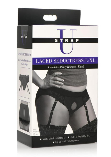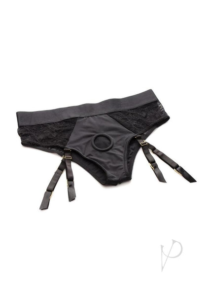Wear these sexy undies and surprise your partner with a harness that includes both form and function! The stretchy spandex and nylon panties have a beautiful lace design that accentuates your curves and hips while still offering support for a strapon dildo. The wide strap at the hips supports the lower back and helps hold up the weight of the dildo. You can enjoy giving and receiving with this crotchless set that also includes a slit in the back for access to your derriere! At the front is an O-ring that fits most dildos and another layer right behind it to reduce chafing that the dildo base sits against. The opening to the O-ring has a 1.75 inch diameter. Enjoy wearing stockings? The garter belt straps help keep up a cute pair of stockings for those who enjoy wearing them! To clean after use, you can wash it in the machine on cold, but to keep the elasticity for longer make sure to hand wash in cold and air dry.Wear this cute pair of panties and be ready for pegging play whenever and wherever without messing with a bunch of bulky harness straps! You don`t have to look like you`re trying to gear up for a leather show when you want to get into some strapon fun! Simply slip these comfortable and sleek panties on and you`re ready to go! Wear it under a pair of pants, leggings or even a tight fitting dress! Bring a compatible strapon dildo in your purse or bag and strap it in when it`s time. The dildo slips in between the lower layer of fabric on the panties and pushes through the O-ring to be securely held in place. Enjoy having fun while looking great doing it! As a bonus, if you enjoy getting licked, played with or teased, your crotch and derriere is exposed as well!Measurements:17.5 inches unstretched waistband diameter, fits 35 inch to 40 inch waist circumference.O-ring inner diameter is 1.75 inches.Materials: Nylon, SpandexColor: BlackNote: Can be machine washed on a cold setting with no bleach added. To preserve the elasticity of the material, hand wash in cold water and air dry.Key Features:Wide Elastic Strap: The wide strap offers better support and comfort while wearing.Stretchy Material with Garter Belt Straps: Enjoy the stretchy, soft feel of nylon and spandex.Crotchless with Booty Access: Enjoy giving and receiving with strapon panties that have an opening for both your crotch and derriere!Universal O-Ring: The O-ring in front fits most standard dildo sizes with a diameter of 1.75 inches.