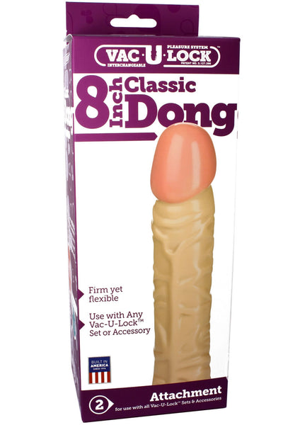 Lock this whopper into place for a memorable strap-on experience. This 8 inch Classic Dong attachments offers for the ultimate in easy access and non-slip action. An indispensable addition to your roster of Vac-U-Lock toys. phthalate-free, body-safe. Proudly Made in America.